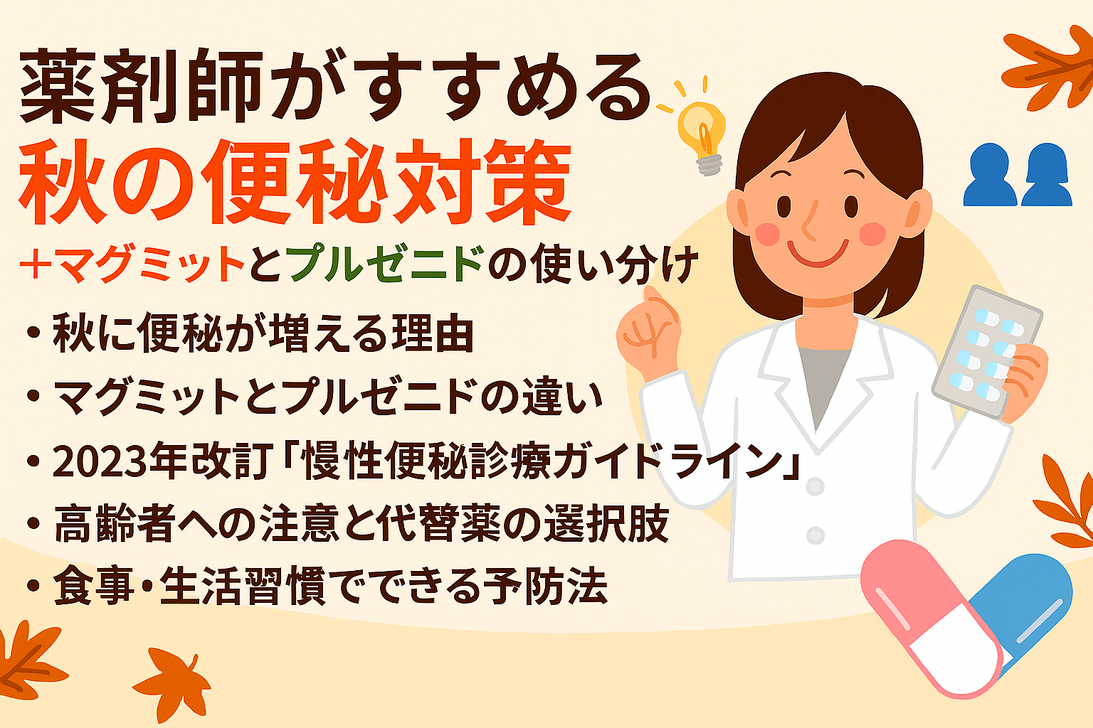 薬 🍁薬剤師がすすめる秋の便秘対策|マグミットとプルゼニドの使い分け+最新ガイドライン解説 秋に増える便秘の原因と対策を薬剤師が解説。マグミットとプルゼニドの使い分けや最新ガイドライン、高齢者への注意点も紹介。 2025.10.08 薬